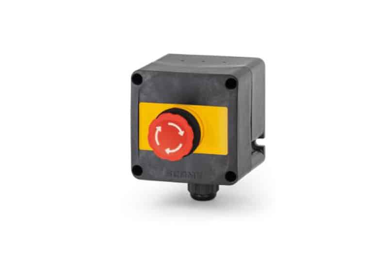 Thermoplastic emergency stop box from the COMPACT-EX[GD] series with rotating emergency stop function.