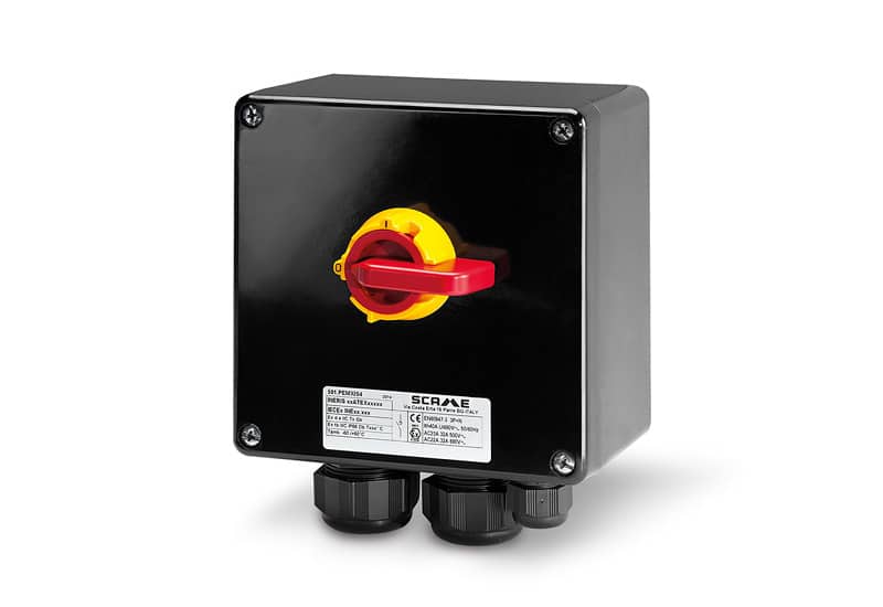 SWITCH, 3/4 POL+ 1NO, 20A, ATEX II 2GD 591 AEM2004-1, RED/YELLOW GREB, ALUKAPSLING:202x232x142, SCAME