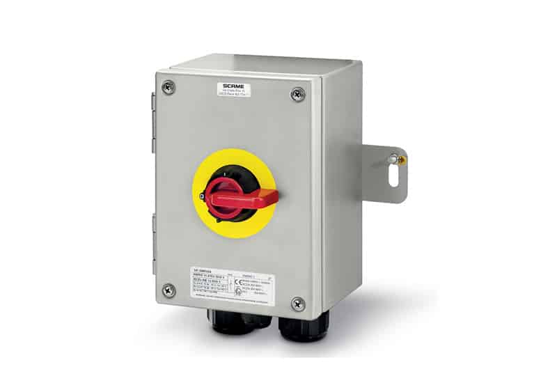 SWITCH, 3/4 POL+ 1NO, 20A, ATEX II 2GD 591 SEM2004-1, RED/YELLOW GREB, STAINLESS STEEL ENCLOSURE:141x200x126, Scame