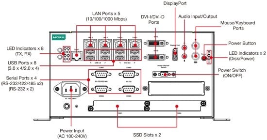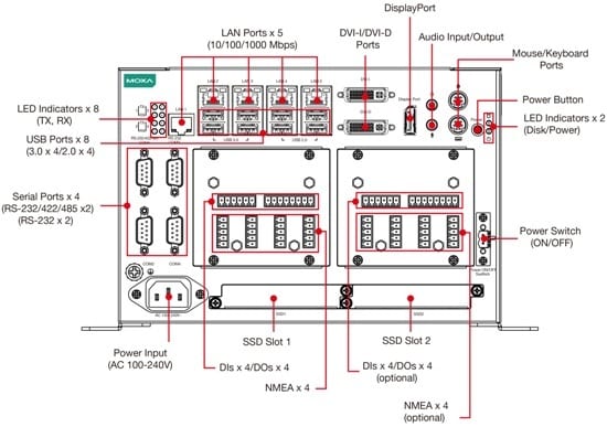 > 9x USB 2.0 and 3.0, 5x GB LAN, 4x Serial ports, Audio in/out